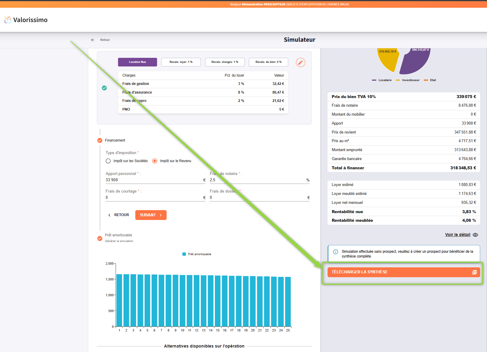 Lors de la réalisation d’une simulation, vous avez la possibilité de télécharger l’étude personnalisées via un bouton intitulé “Télécharger la synthèse”.
