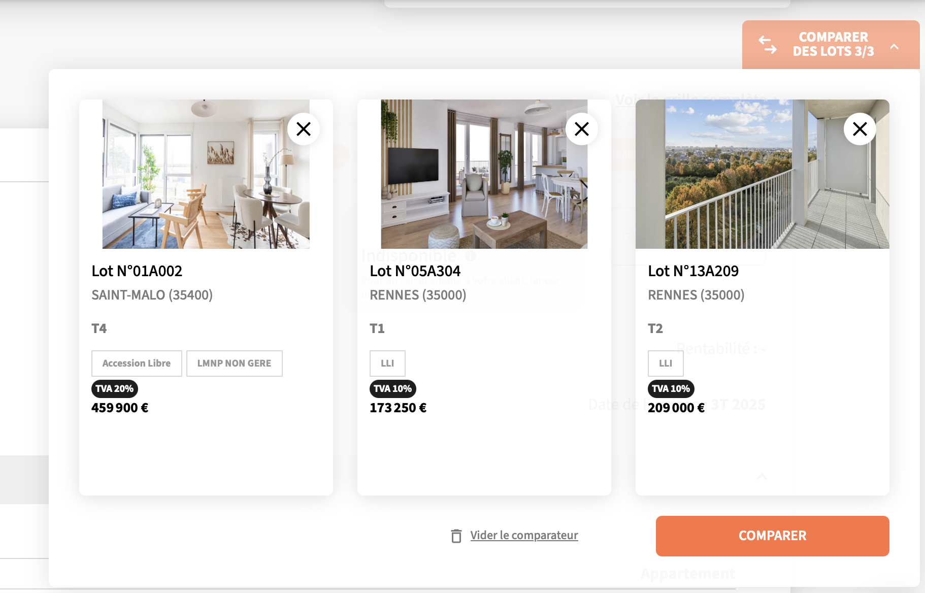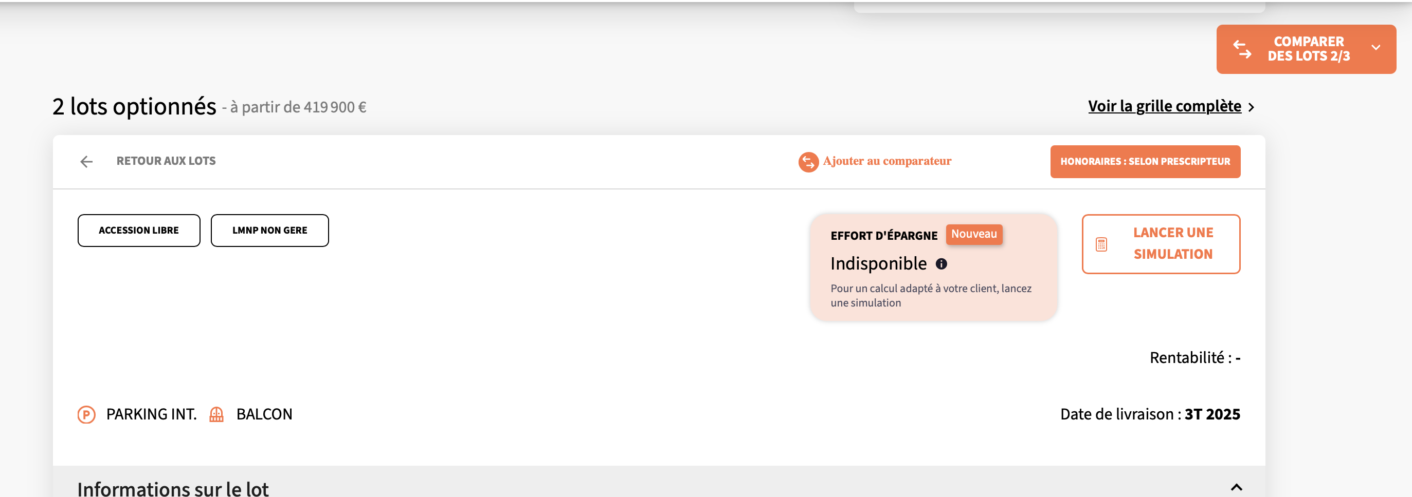 Pour comparer jusqu’à 3 lots, rendez-vous sur la page d’un programme et cliquez sur ”Ajouter au comparateur”. Une fois sélectionné, le lot s’ajoute automatiquement dans l’onglet comparateur (en haut à droite).