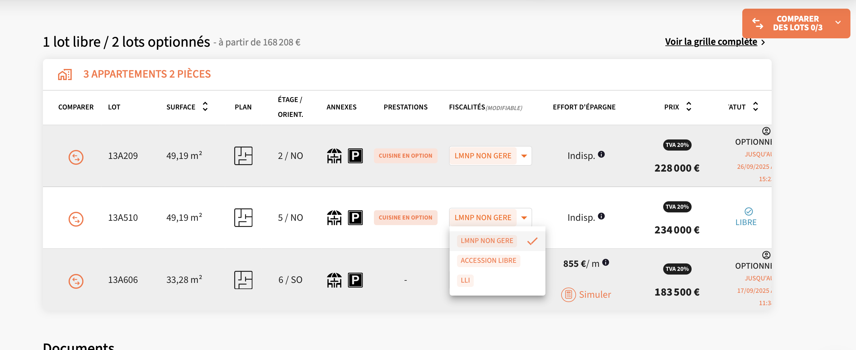 Sur la page programme, vous pouvez sélectionner la fiscalité souhaitée sur le les différents lots, les données et les prix s’ajusteront en conséquence.